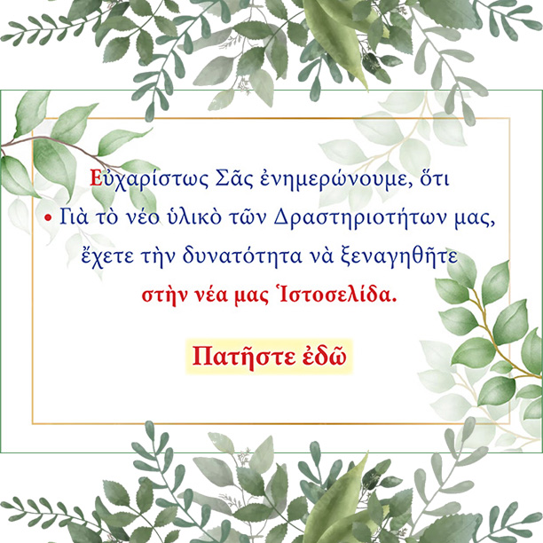 Ἐν ὄψει τῆς Ἑορτῆς τοῦ Προστάτου τοῦ Συλλόγου μας, Ἁγίου Φιλαρέτου, ἔχουμε ἑτοιμάσει μὲ τὶς πρεσβεῖες Του, καὶ τὴν εὐλογία τοῦ Σεβασμιωτάτου Μητροπολίτου μας κ. Κυπριανοῦ, μία νέα βελτιωμένη μορφὴ τῆς [...]