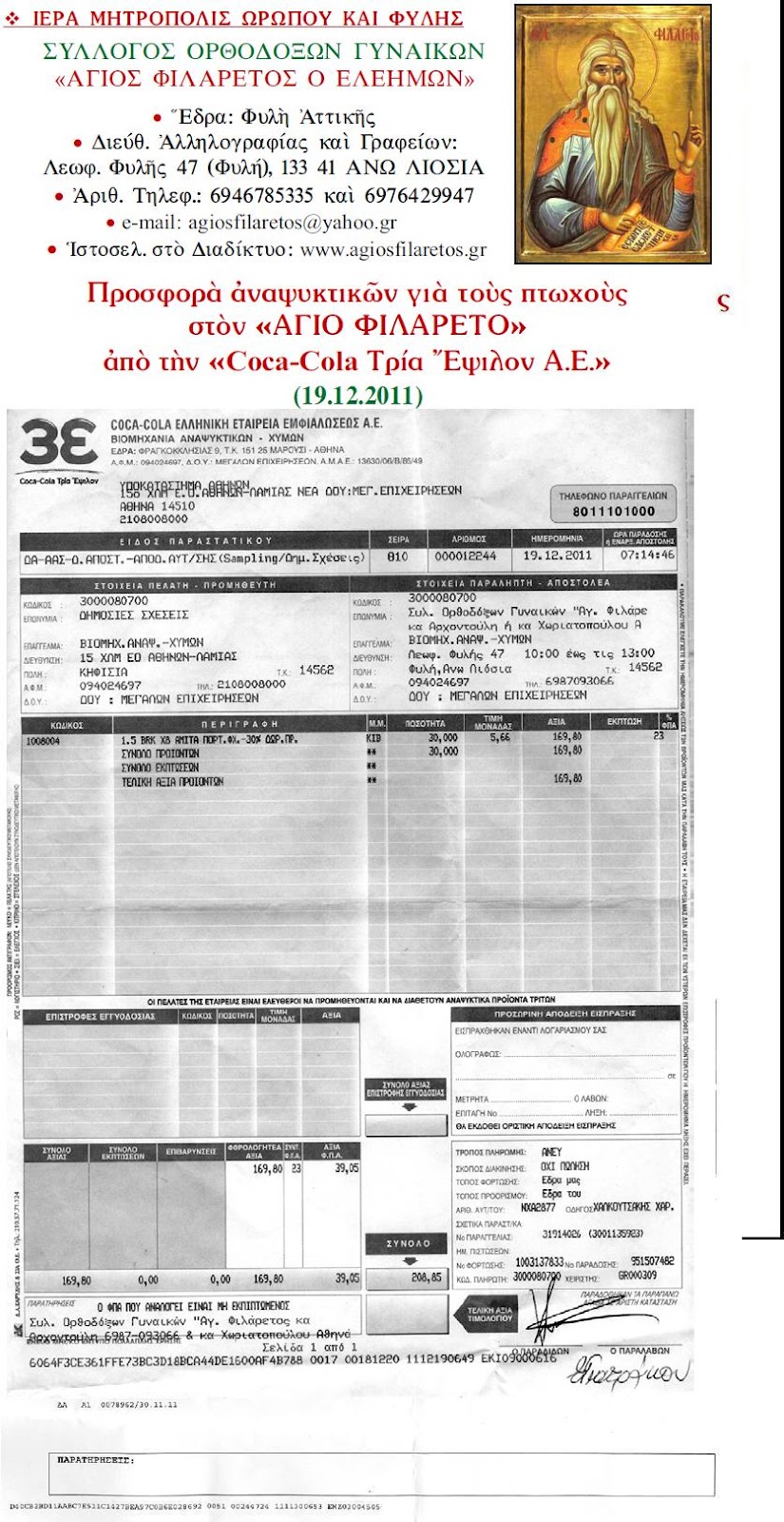 Αποδείξεις δωρεών από COCA-COLA ΤΡΙΑ ΕΨΙΛΟΝ Α.Ε. 19.12.2011