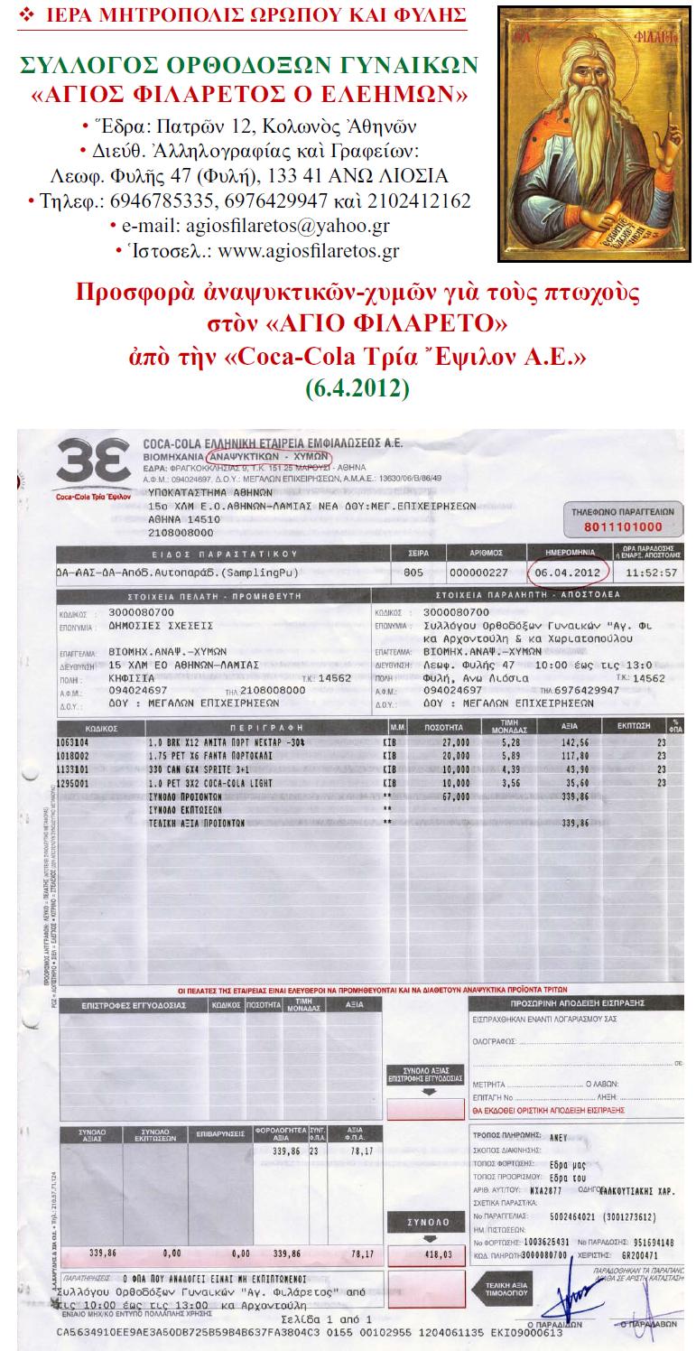 Αποδείξεις δωρεών από COCA-COLA ΤΡΙΑ ΕΨΙΛΟΝ 6.4.2012