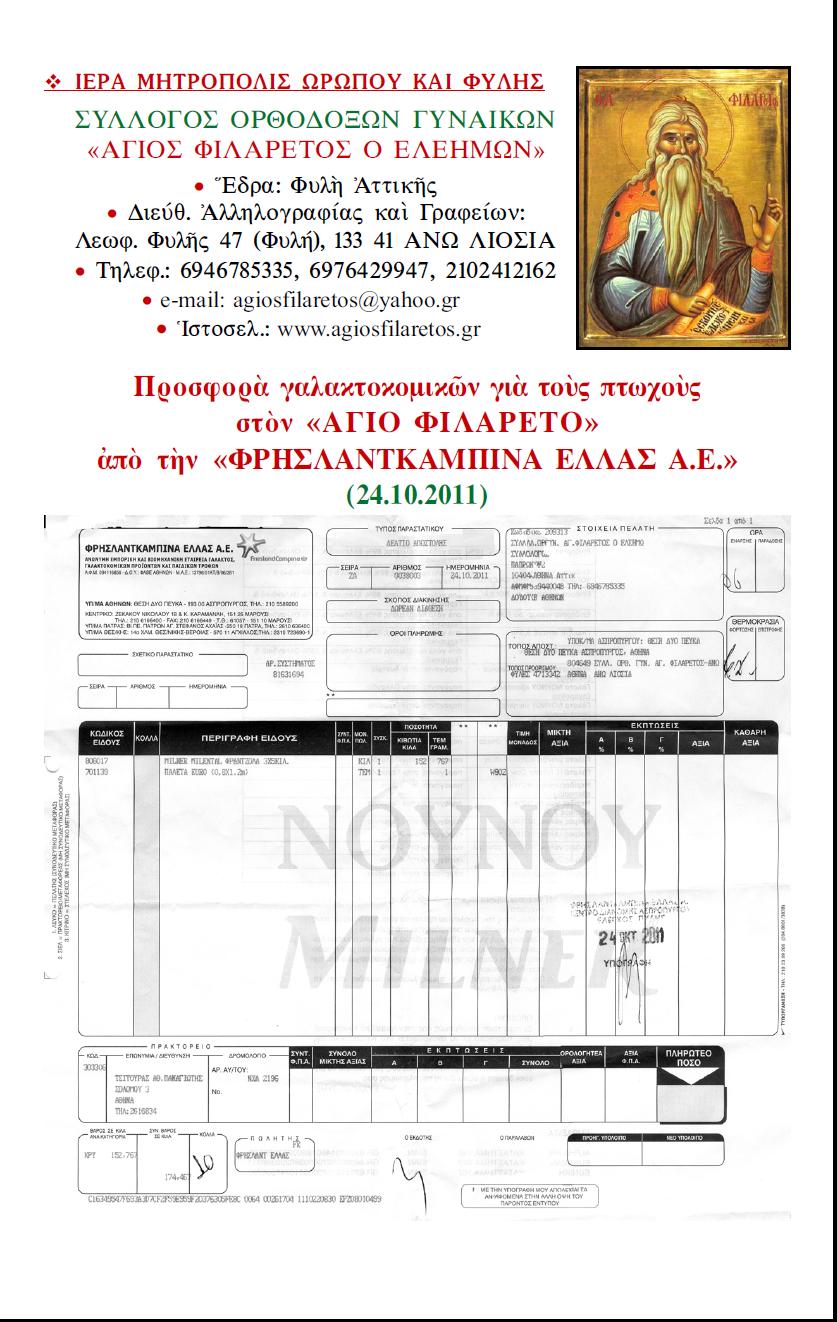 Αποδείξεις δωρεών από ΦΡΗΣΛΑΝΤΚΑΜΠΙΝΑ ΕΛΛΑΣ Α.Ε. 24.10.2011