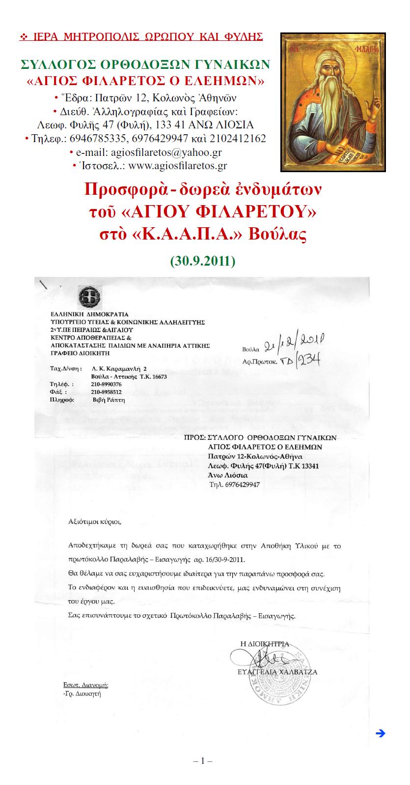 Αποδείξεις δωρεών από Σ.Ο.Γ. Αγ. Φιλάρετος προς το Κ.Α.Α.Π.Α. Βούλας 30.9.2011