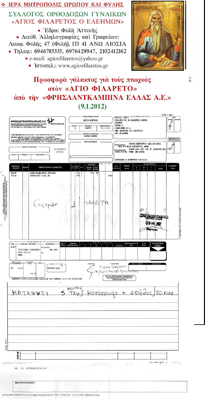 Αποδείξεις δωρεών από ΦΡΗΣΛΑΝΤΚΑΜΠΙΝΑ ΕΛΛΑΣ Α.Ε. 9.1.2012