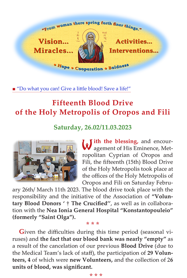 Fifteenth Blood Drive of the Holy Metropolis of Oropos and Fili Saturday, 26.02/11.03.2023
