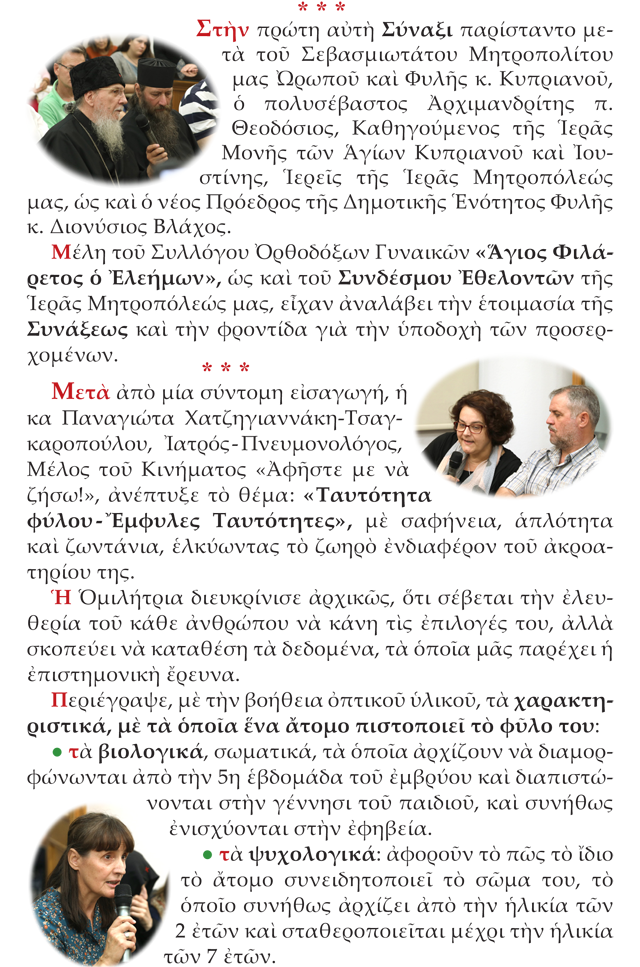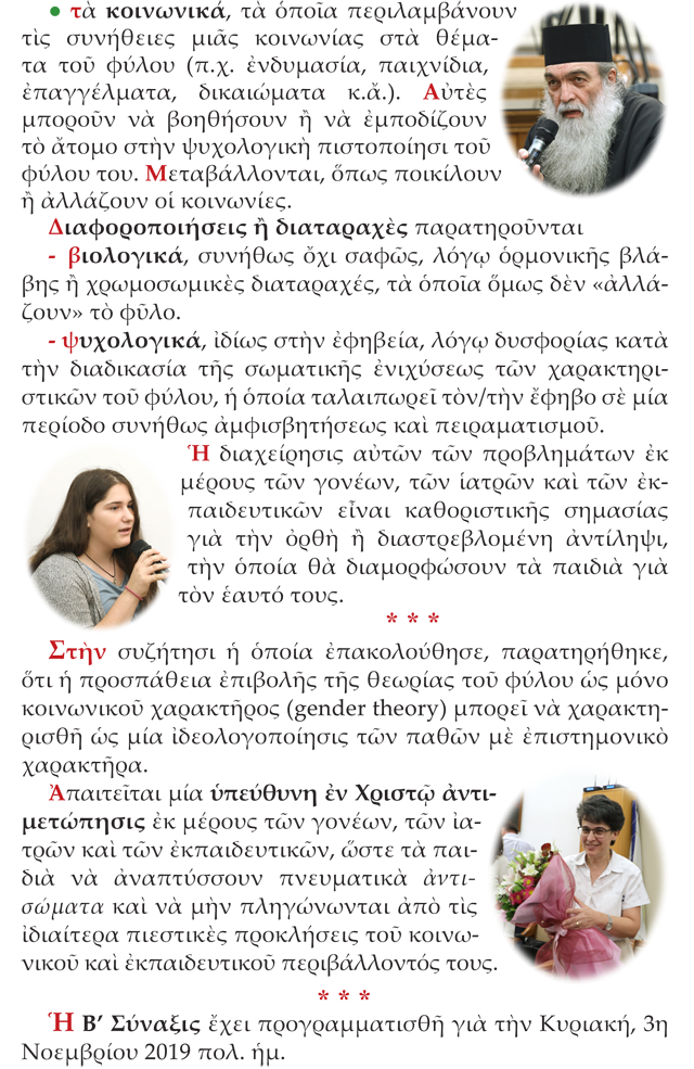 «Συνάξεις Ἐνημερωτικὲς» Περίοδος Δ’, 2019-2020 Διάλεξις Α’ «Ταυτότητα φύλου-Ἔμφυλες Ταυτότητες»